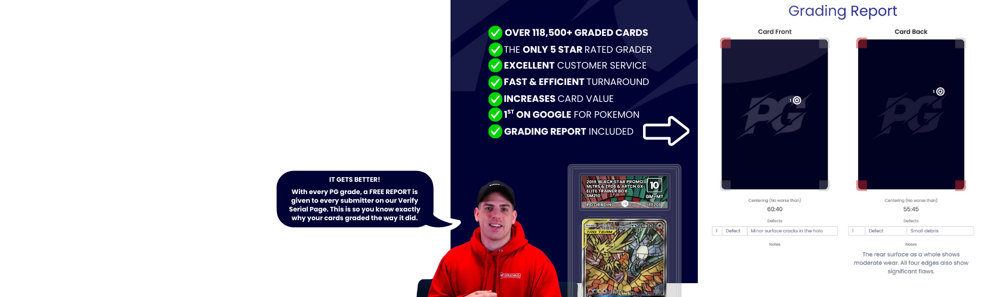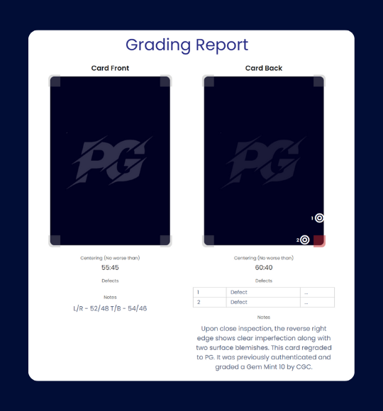 PG grades tough, fair and transparently. Each card you grade with us has a unique grading report attached to your labels QR code. This explains the ‘why’ behind the grade at no extra cost. Our standard service will currently grade, encapsulate & return your cards in just 5 working days.